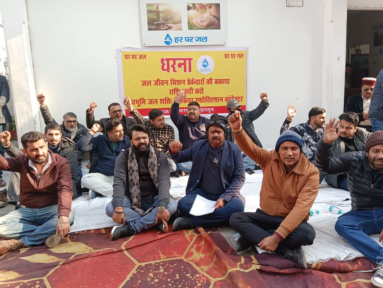 देहरादून: देवभूमि जल शक्ति कांट्रेक्टर वेलफेयर एसोसिएशन, देहरादून की ओर से जल जीवन मिशन कार्यालय इंदर रोड में धरना प्रदर्शन किया एवं ठेकेदारों ने जल जीवन मिशन कार्यालय में ताला जड़ दिया एवं अपनी बात रखी। इस धरणा का मुख्य उद्देश्य जल जीवन मिशन से जुड़े हुए ठेकेदारों के भुगतान में हो रही देरी एवं उनके ऊपर विभागों द्वारा अत्याचार, ग्राम प्रधानों द्वारा योजना को वेरिफाई कराने से संबंधित रहा। वहीं ठेकेदारों ने मिशन डायरेक्टर (आईएएस) विशाल मिश्रा को ज्ञापन दिया। इस धारणा में जेपी अग्रवाल, ध्रुव जोशी, यशपाल चौहान, सुनील गुप्ता, सचिन मित्तल, अंकित सालार, जगजीत सिंह एवं पीड़ित ठेकेदारों का समूह भी शामिल रहे।