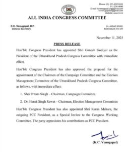 कांग्रेस हाईकमान ने गणेश गोदियाल को प्रदेश कांग्रेस कमेटी का नया अध्यक्ष नियुक्त किया है। कांग्रेस महासचिव के सी वेणुगोपाल ने नियुक्ति के आदेश जारी कर दिए हैं।
