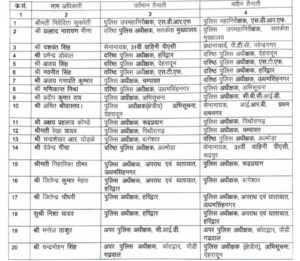 रुद्रप्रयाग के एसपी अक्षय प्रहलाद कोण्डे को एसपी पिथौरागढ़ बनाया है, उनकी जगह एसपी अपराध एवं यातायात यूएसनगर निहारिका तोमर को भेजा है। एसपी अपराध एवं यातायात हरिद्वार जितेंद्र कुमार मेहरा को एसपी बागेश्वर की जिम्मेदारी सौंपी है। एसपी बागेश्वर चंद्रशेखर आर घोड़के को एसएसपी अल्मोड़ा बनाया गया है। एसएसपी अल्मोड़ा देवेंद्र पींचा को 31वीं वाहिनी पीएसी में सेनानायक पद पर तैनात किया गया है।
